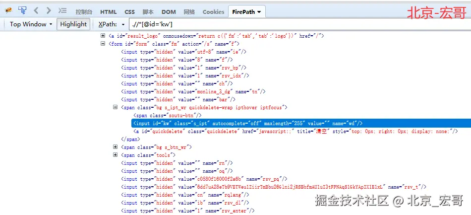 这里介绍如何通过节点中name的值来定位这个web元素。还是来看百度首页搜索输入框,通过name的值来定位。