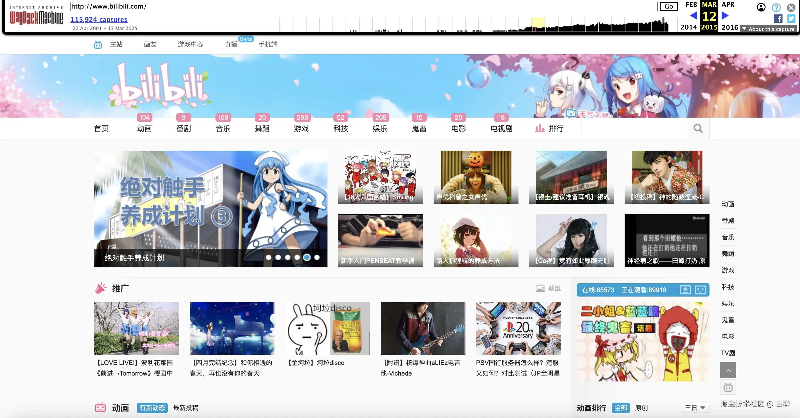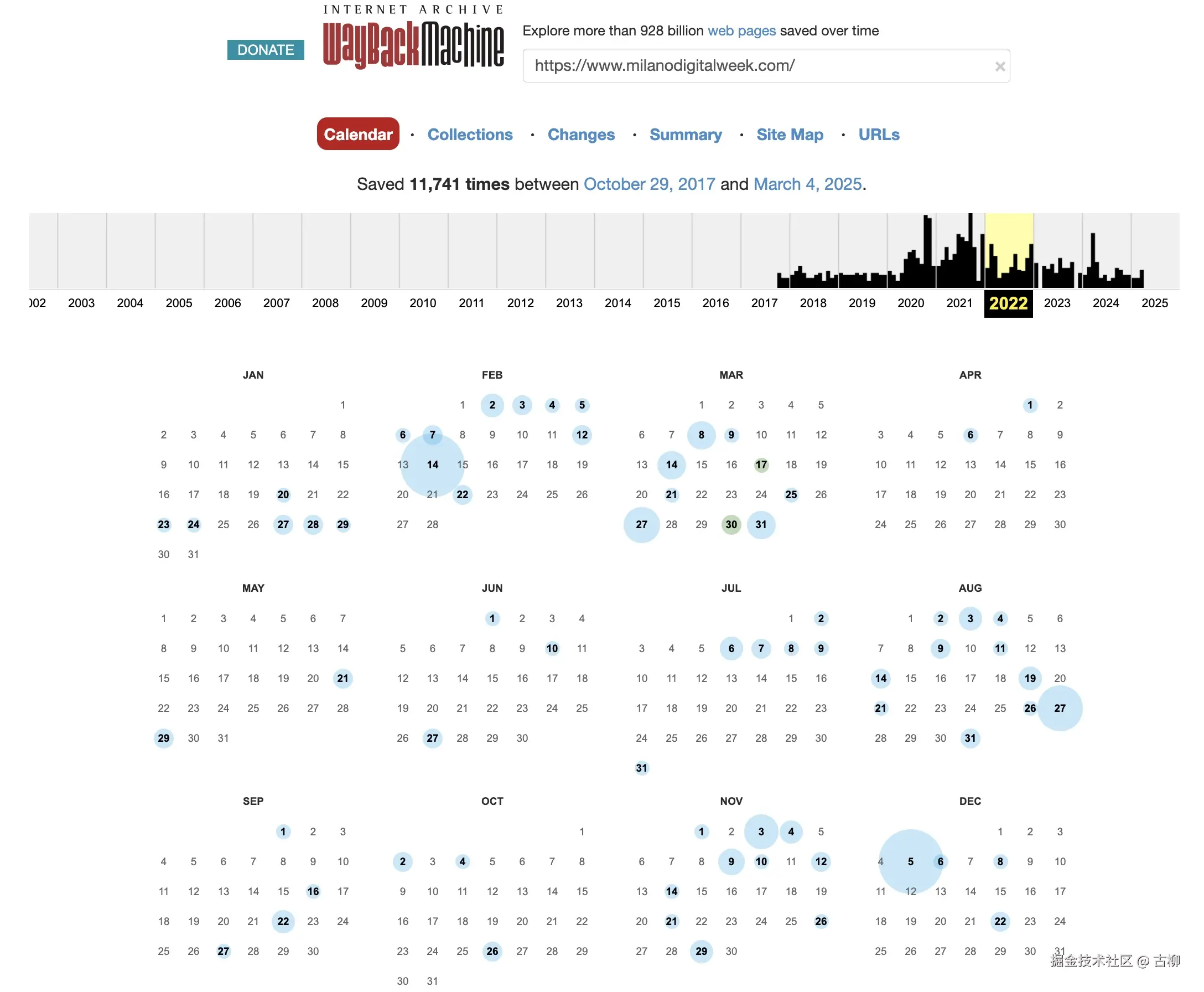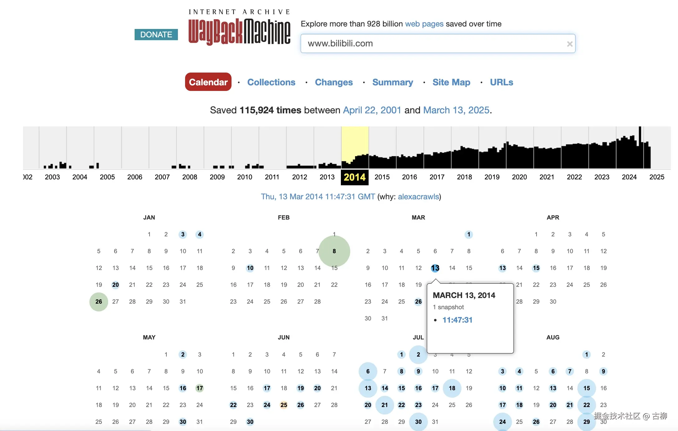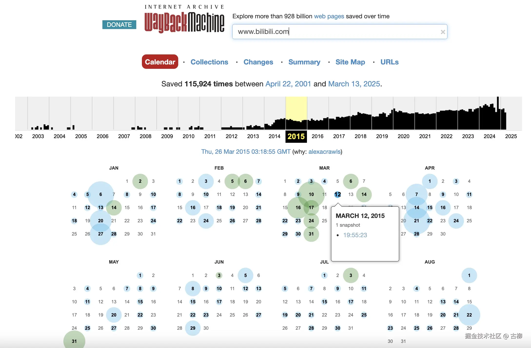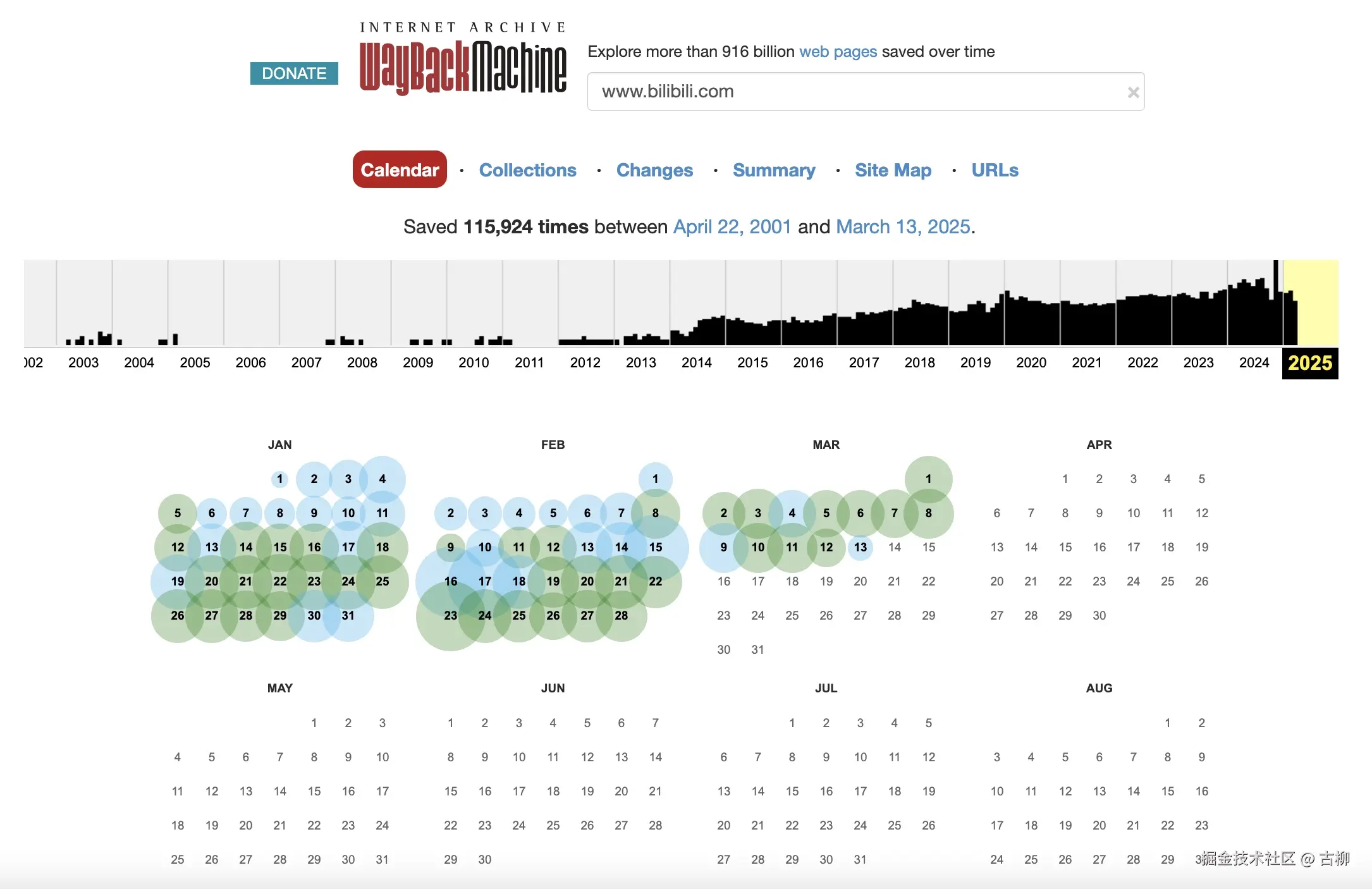 简单演示下如何使用,搜索框里可以输入任何感兴趣的网站。比如输入 www.bilibili.com 后果显示目前存档了 115924 次,下方柱形图里可以先选择年份,再选择下面12个月份日历里的日期,圆圈表示当天有过存档,越大的表示存档次数越多。