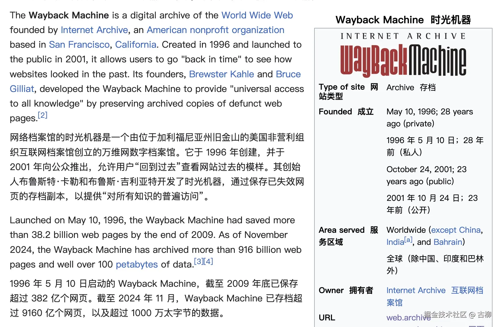 而且古柳还专门提到一个特别神奇的网站——Wayback Machine 网站时光机,里面可以查看其他网站过去的样子,即便是已经下线打不开的网站也能看到。从维基百科上可知,目前该网站里已存档超过9160亿个网页。