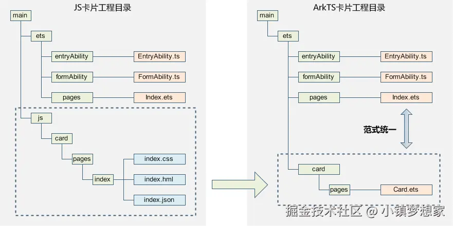 - Stage模型支持两种卡片UI开发方式,可以基于声明式范式ArkTS语言开发卡片(简称ArkTS卡片)、也可以基于类Web范式JS语言开发卡片(简称JS卡片)。