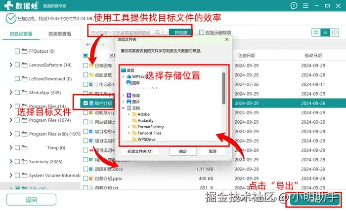 第2步:软件拥有强大的扫描技术,能够将扫描文件的基本信息都显示给用户,帮助用户更快找到自己的目标恢复文件;如果找不到文件,可以选择使用“搜索框”、“筛选器”等工具协助,选好文件后点击“导出”;最后选择需要存放文件的位置即可。