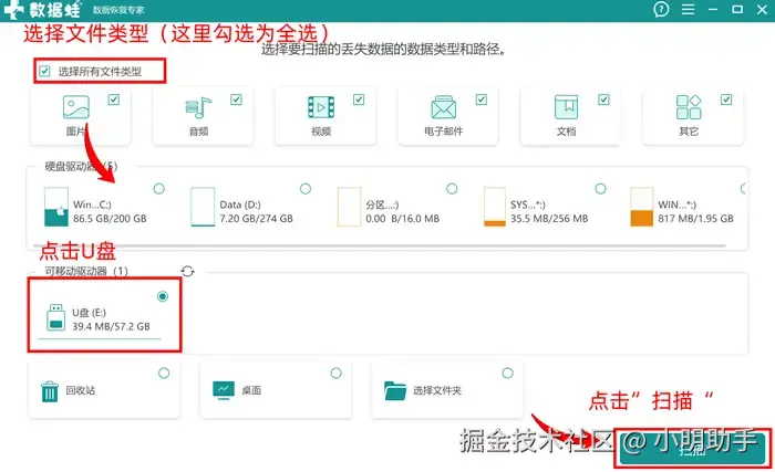 步骤1:打开数据 蛙恢复专家,在软件首页选择适合的文件类型,选上U盘,点击“扫描”;