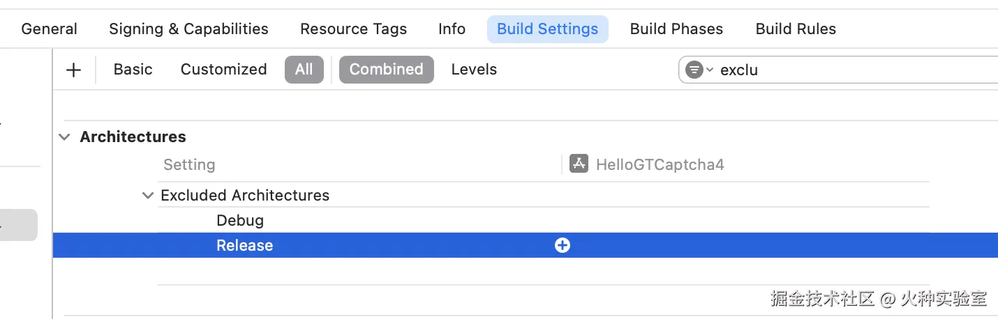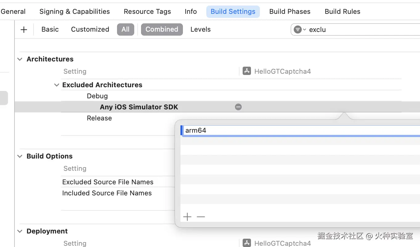 在Build settings中搜索 exclu,找到Excluded architectures,分别点击Debug和Release右侧的“+”