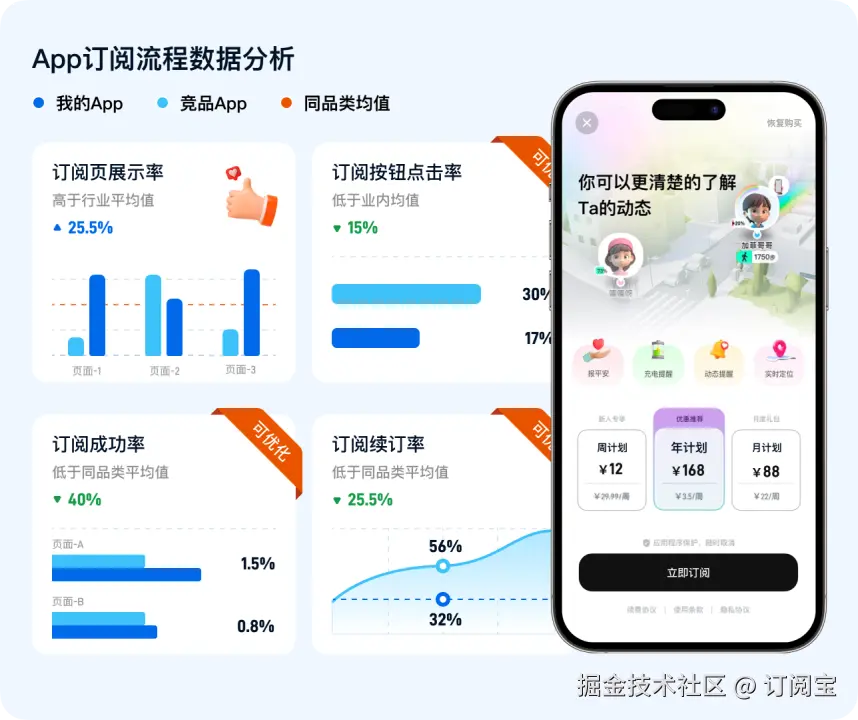 深入分析订阅数据:分析订阅流程的转化,全面优化订阅页面展示率、点击率、成功率及续订率,与传统订阅分析产品不同的是,订阅宝更多聚焦于订阅页面本身的设计合理性,通过全面分析订阅页面的结构、交互、视觉和动效,甚至是定价和IAP,组合出更高付费率的订阅页面。