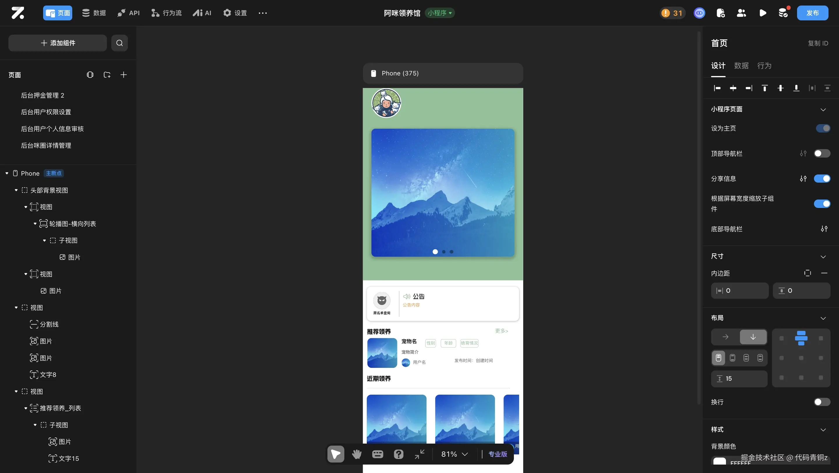 这个平台的原子级组件让样式设计完全自由,功能模块也能随心配置,不仅能展示领养信息,还能增加领养者身份认证、保证金缴纳、后续回访等关键环节。不到半个月,小程序就顺利上线了。
