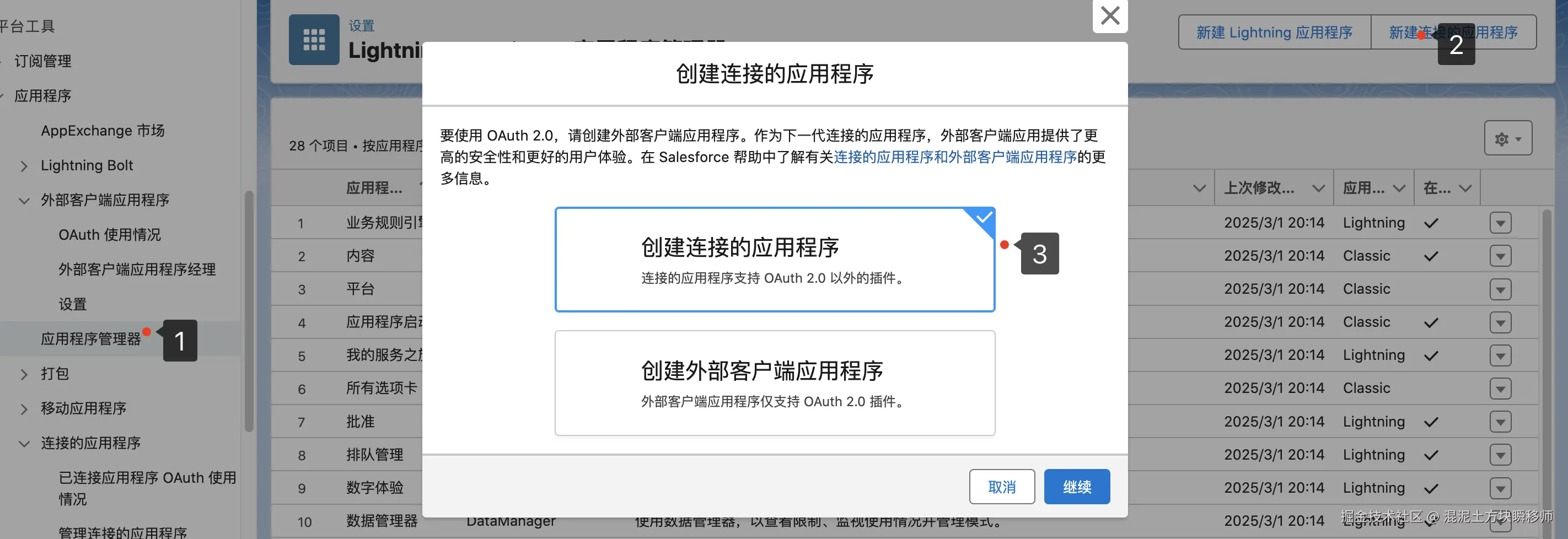 点击 "New Connected App"(新建链接的应用程序),在弹出的窗口中选择 "创建链接的应用程序"。填写应用的基本信息,建议开启 "PKCE" 授权以增强安全性。