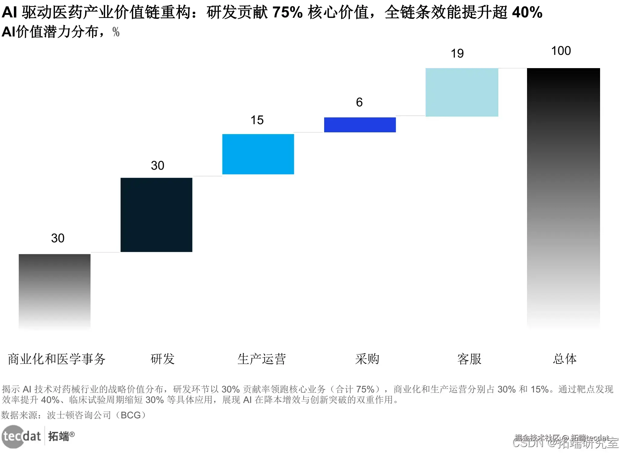 AI在医药行业的价值潜力呈现显著分化:核心业务(研发、商业化、生产)贡献90%价值,其中研发环节占比达75%。具体应用场景包括: