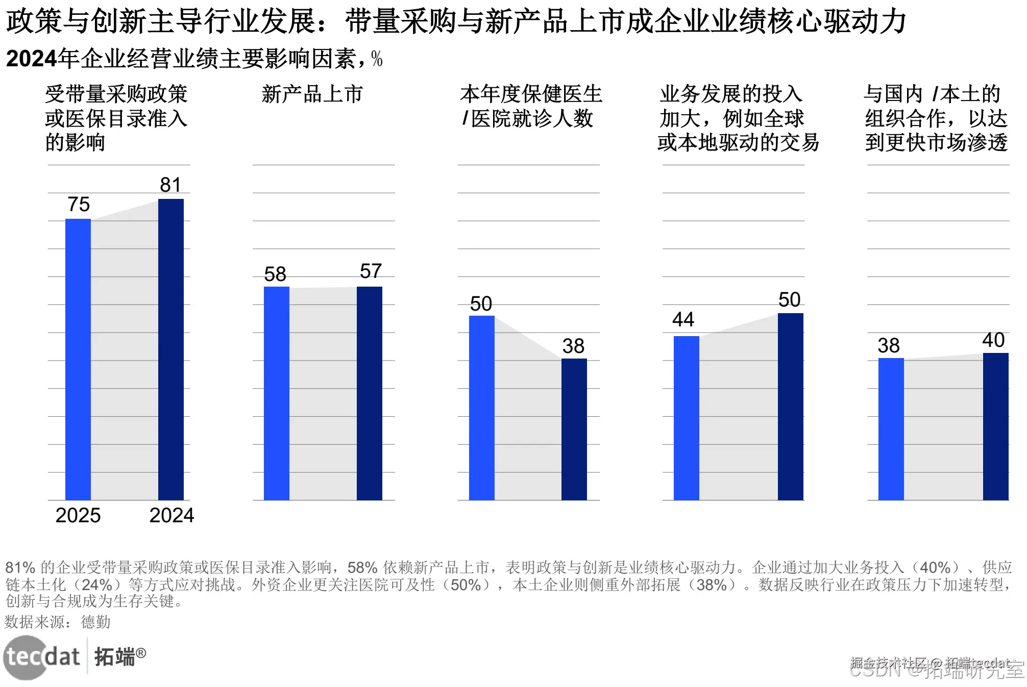 带量采购(81%)与新产品上市(58%)是企业业绩核心驱动力。国有企业/私营企业加速“走出去”,寻求海外授权合作;外资企业则聚焦本土资产布局。数据显示,82%企业调整了营销团队以应对渠道变化,72%强化政府事务能力,但研发投入增速放缓,外资企业尤为明显。