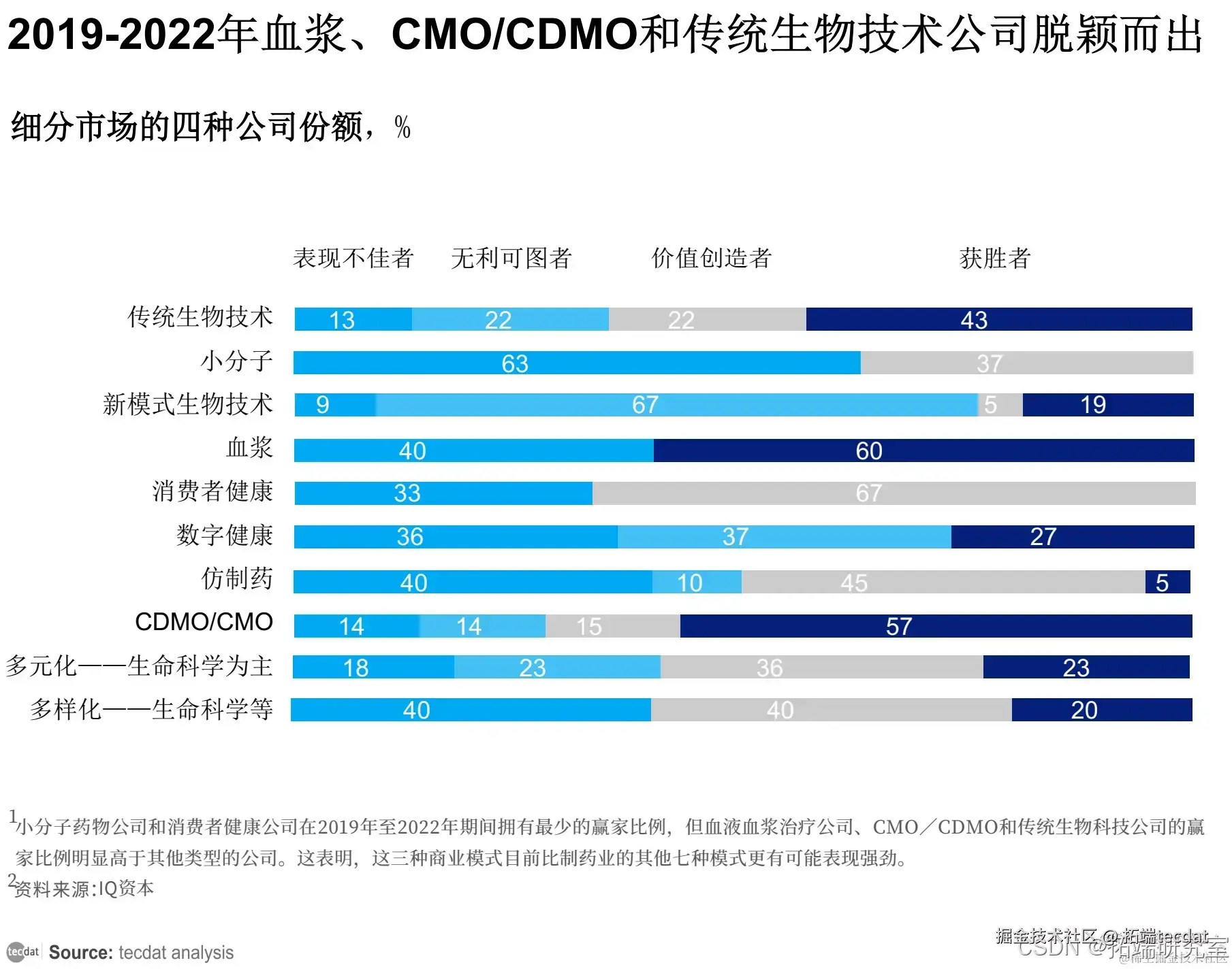 2019-2022年血浆、CMO/CDMO和传统生物技术公司表现出色,小分子药物公司面临价格压力和创新困境。传统生物科技公司通过针对性收购实施战略,但部分企业面临生物类似药竞争挑战。