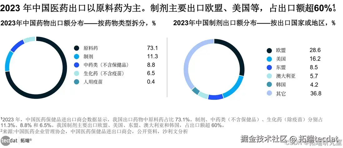 2023年中国医药出口以原料药为主(73.1%),制剂、中药类占比分别为11.3%和8.8%。制剂主要出口欧盟、美国、东盟等地区,共占出口额超60%。
