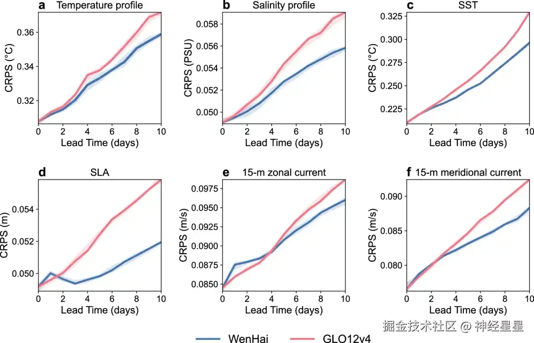 「问海」大模型(蓝线)和法国麦卡托海洋国际中心 GLO12v4 数值预报系统(红线)在2024年4月至11月期间的预报结果的连续排名概率得分(CRPS,越低越好)。