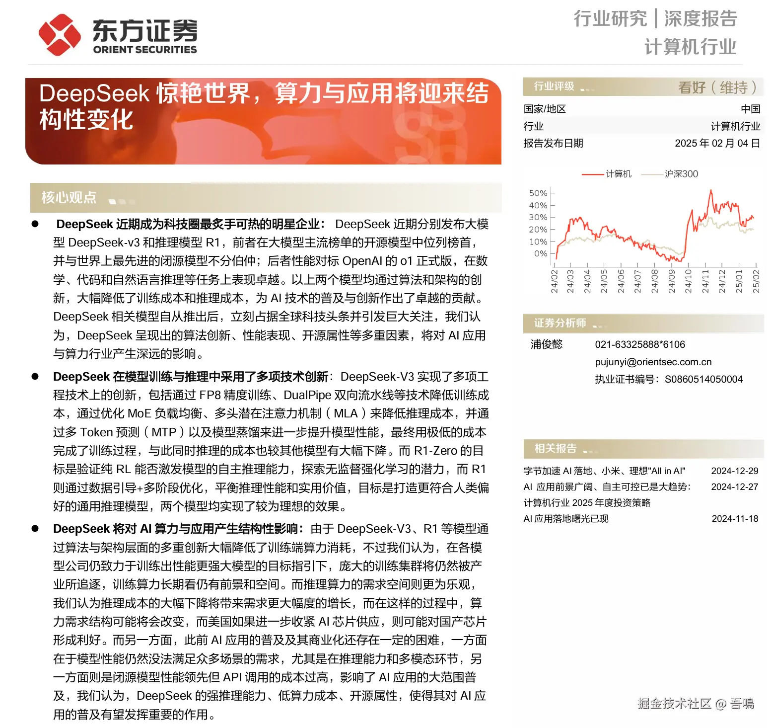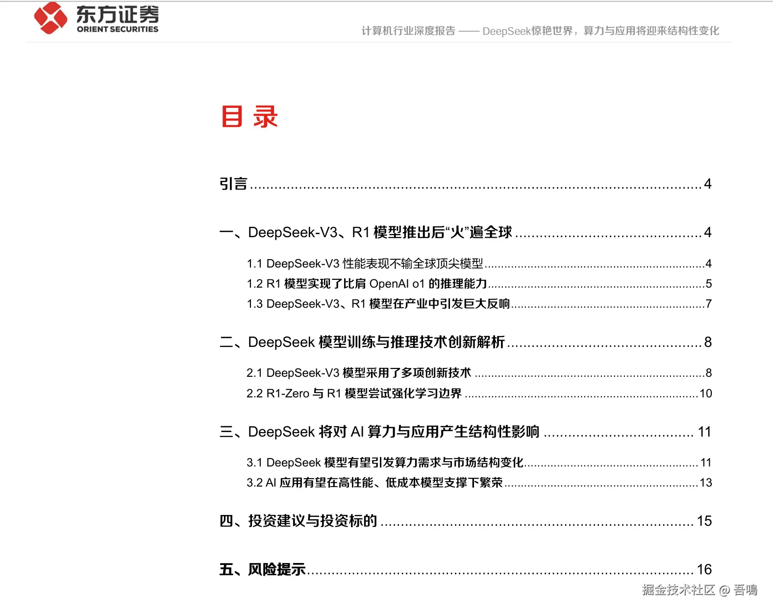 今天吾鳴要给大家分享的是由东方证券出版的DeepSeek报告——《DeepSeek惊艳世界,算力与应用将迎来结构性变化》。这份报告主要从DeepSeek性能与市场反响、技术创新解析、算力与应用的潜在影响、投资建议和风险提示这几大部分对DeepSeek做了全面的介绍。报告是一份PDF电子书,一共有18页,内容很丰富。