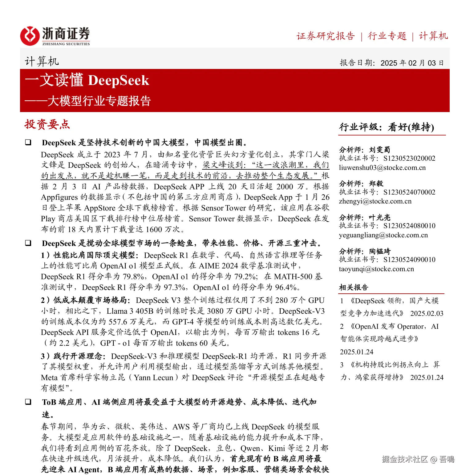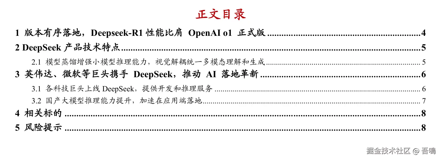 今天吾鳴要给大家分享的是由浙商证券出版的DeepSeek报告——《一文读懂DeepSeek——大模型行业专题报告》。这份报告从投资标的与风险提示、科技巨头合作与行业应用、DeepSeek的技术特点与创新和DeepSeek模型概况与核心优势这几大部分展开介绍DeepSeek。报告是一份PDF电子书,一共9页。