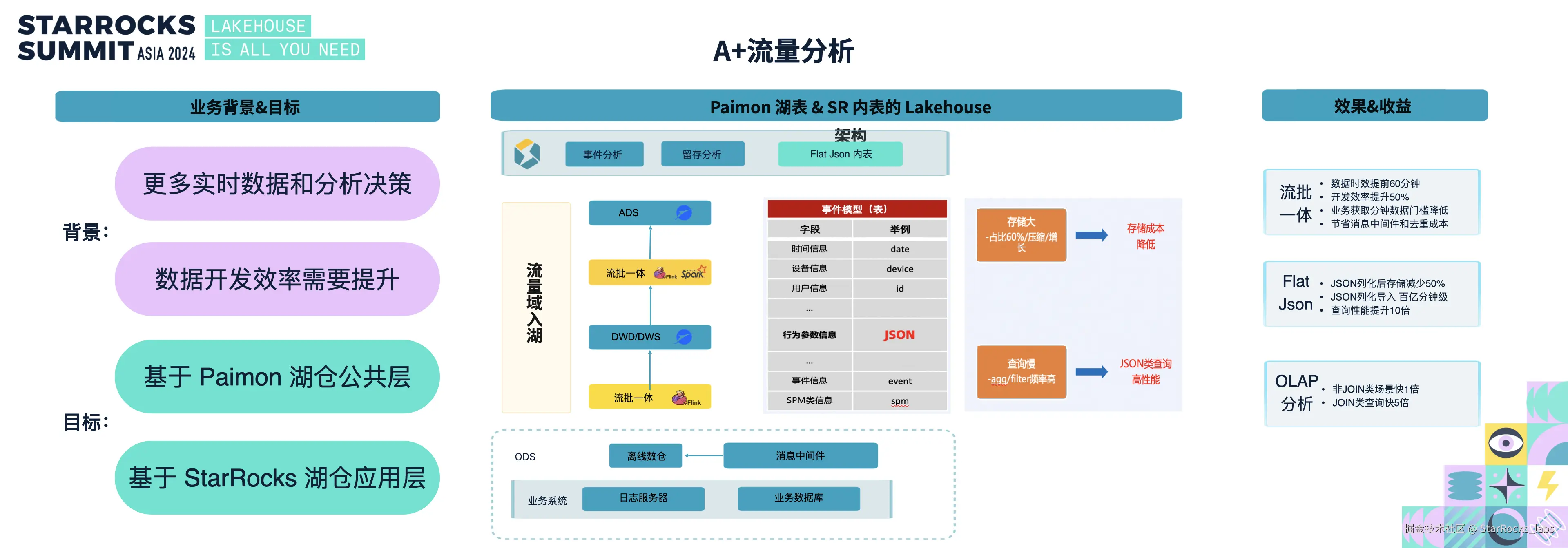另一条链路涉及 JSON 类型流量埋点,数据量极大,Paimon 中难以有效查询,时效性较低。我们通过 StarRocks 3.3 版本后推出的 Flat JSON 特性(与社区共同打磨的成果)来解决这一问题。Flat JSON 在阿里集团已有大规模应用,通过对 JSON 列进行解析和优化,查询性能提升了十倍以上。