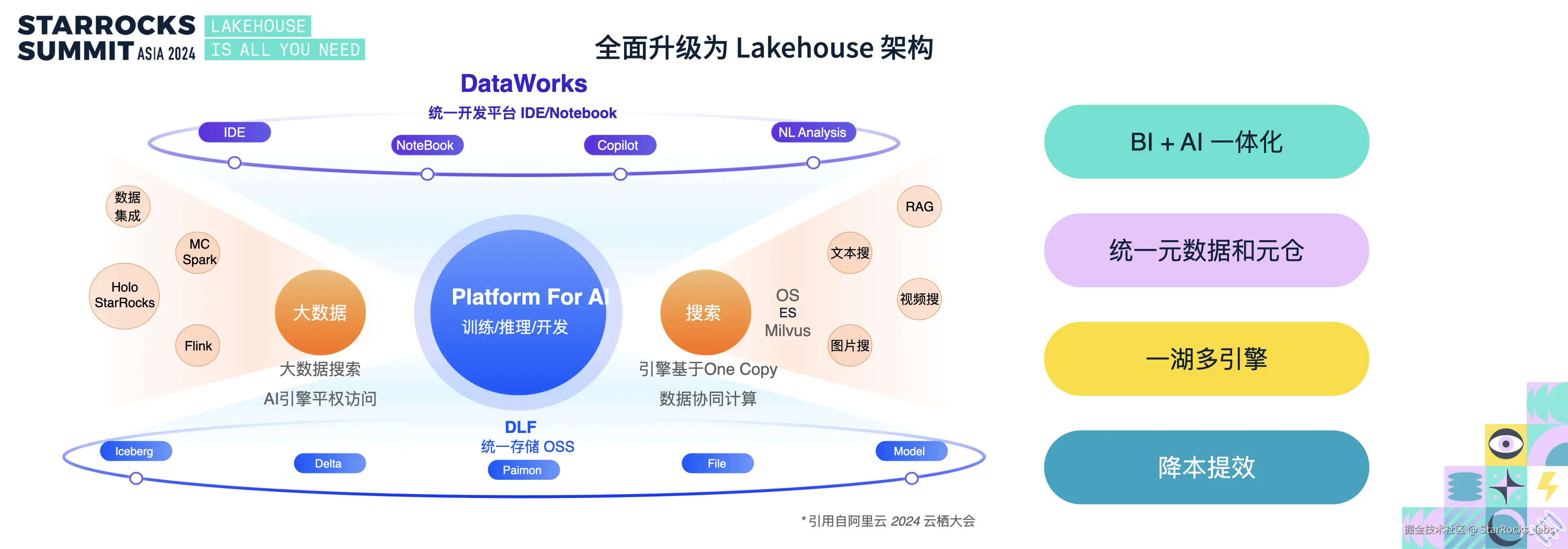 - 数据统一:实现结构化与非结构化数据的统一,为 AI 与 BI 的融合提供支持,确保“Data for AI”和“AI for Data”在阿里集团顺利落地。