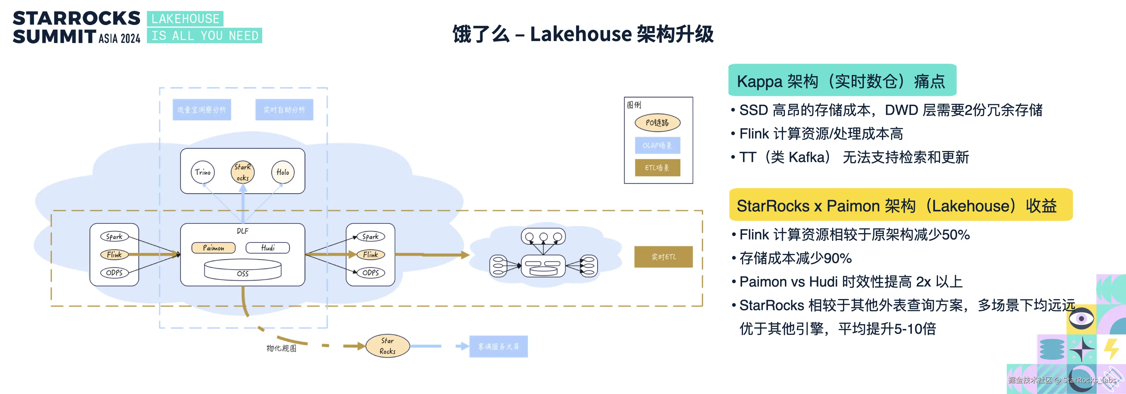 饿了么升级为准实时Lakehouse架构后,在时效性仅损失1-5分钟的前提下,实现Flink资源缩减、StarRocks查询性能提升(仅5%性能损失),存储成本降低90%。