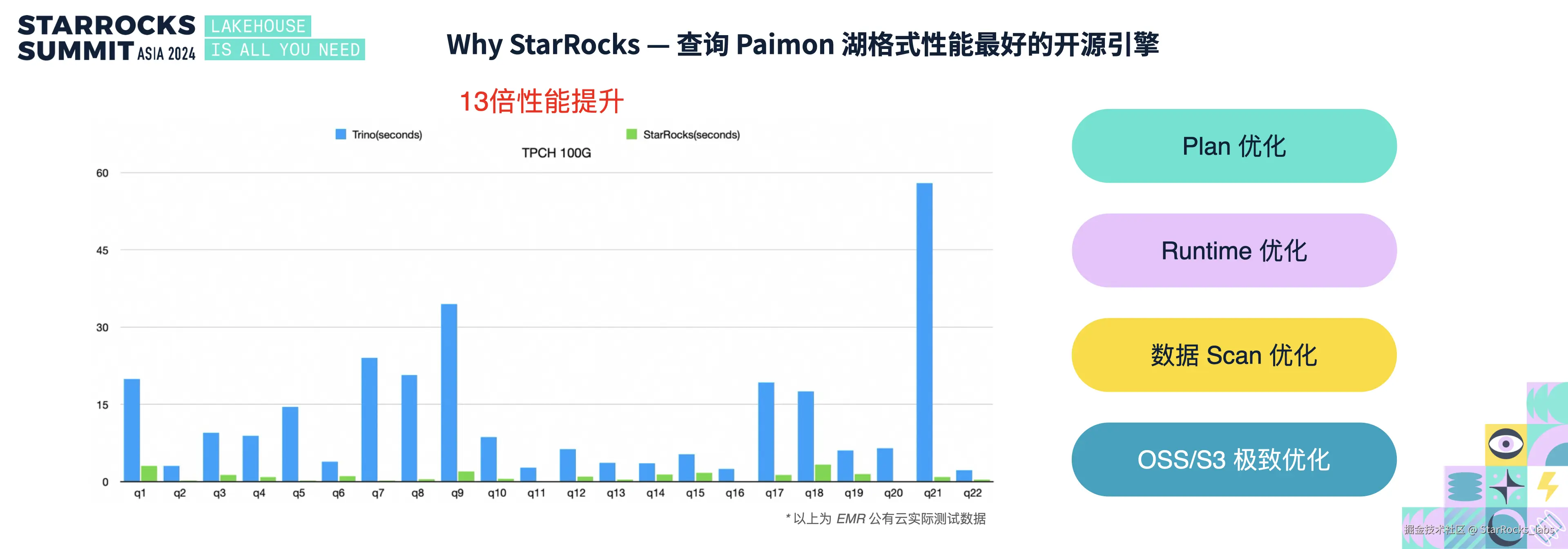 从动态角度看,引擎的发展是循序渐进的。目前,StarRocks 对 Paimon 的支持表现出色,很多优势源于 StarRocks 利用了 Paimon 的独特特性,例如 Paimon Deletion Vector 以及 Manifest Cache 等。如果 Trino 能够补齐这些短板,其性能也将显著提升,但最终 StarRocks vs Trino 仍然有望达到 3~5 倍的性能提升。