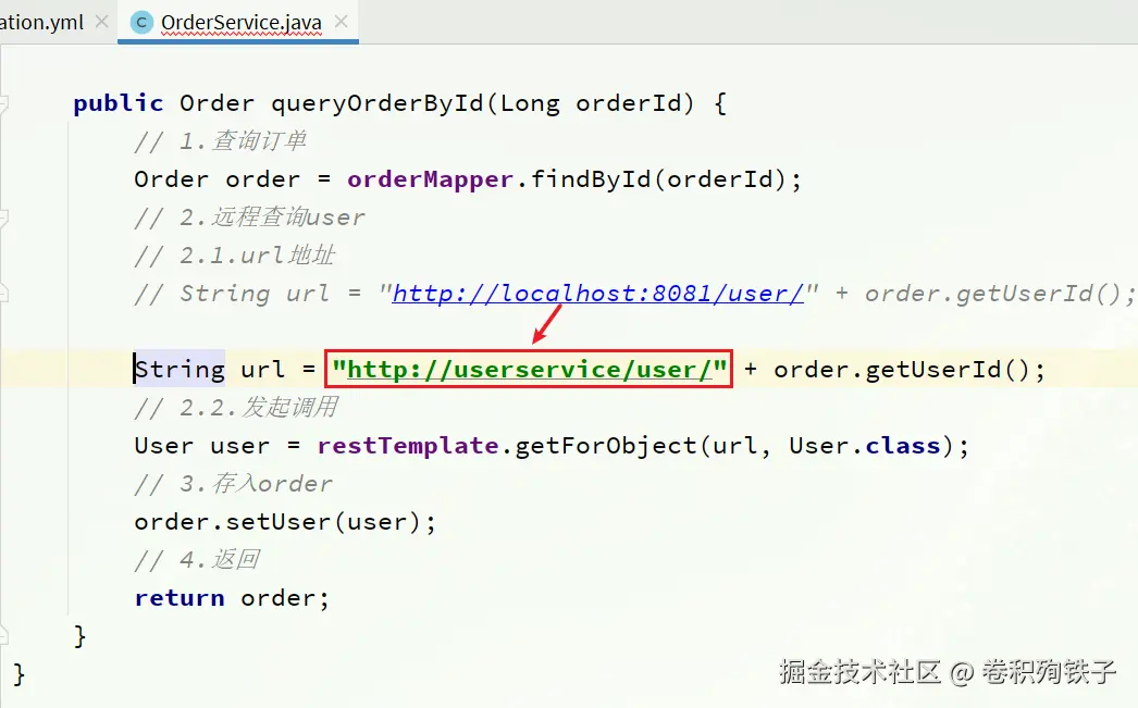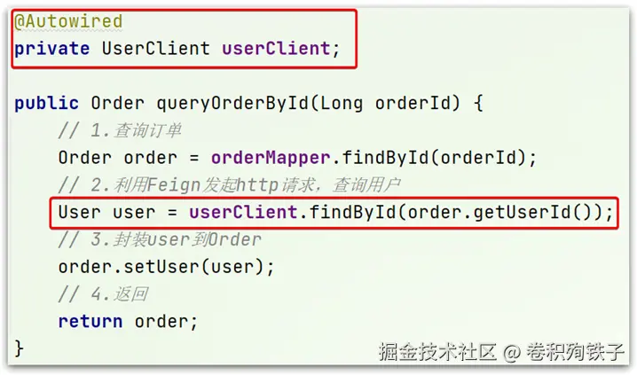 - 修改order-service服务中的OrderService类中的queryOrderById方法,根据Order对象中的userId查询User
