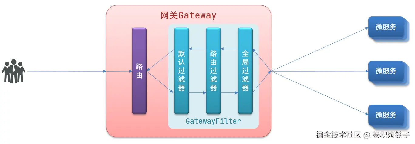 请求进入网关会碰到三类过滤器:当前路由的过滤器、DefaultFilter、GlobalFilter