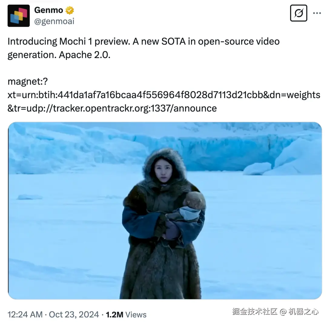 2024 年 10 月,Genmo 推出了 Mochi 1 开源视频生成模型的研究预览版本,可以实现高保真运动和强大实时性,尤其在遵循用户详细指令方面做得很好。