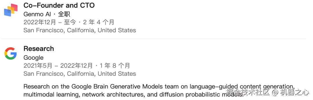 他曾在 Google Brain 工作,创建了首个文本到 3D 生成模型。2022 年 12 月,他共同创立了 Genmo AI 并担任 CTO,这是一家专注于视频生成的 AI 公司。