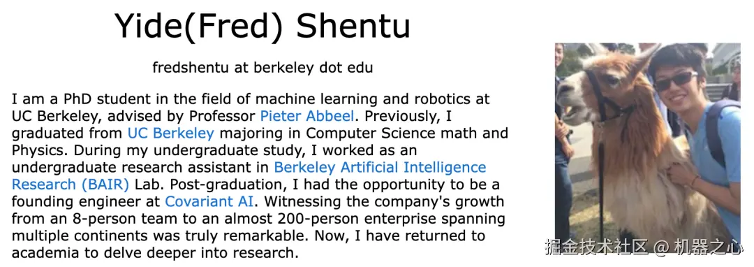 Yide (Fred) Shentu 现为 Pieter Abbeel 的博士生。他本科同样就读于加州大学伯克利分校,主修专业为物理以及数学和计算机科学。本科期间,他曾在 BAIR(伯克利人工智能研究实验室)担任研究助理。本科毕业后,他曾担任机器人公司 Covariant AI 的创始工程师和研究科学家。