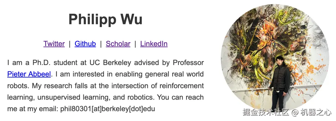 Philipp Wu 现为 Pieter Abbeel 的博士生(2021 年 8 月到 2026 年 5 月)。他的研究兴趣在于现实世界的通用机器人,研究涉及到了强化学习、无监督学习和机器人技术的交叉融合。
