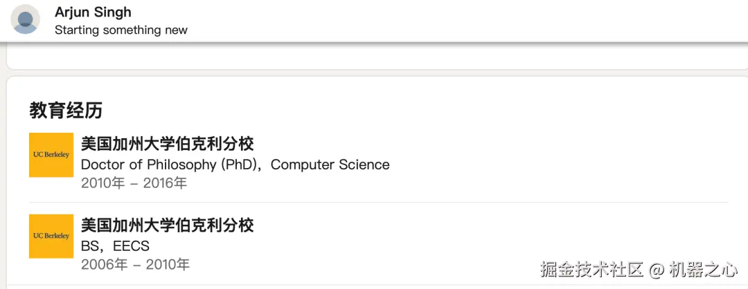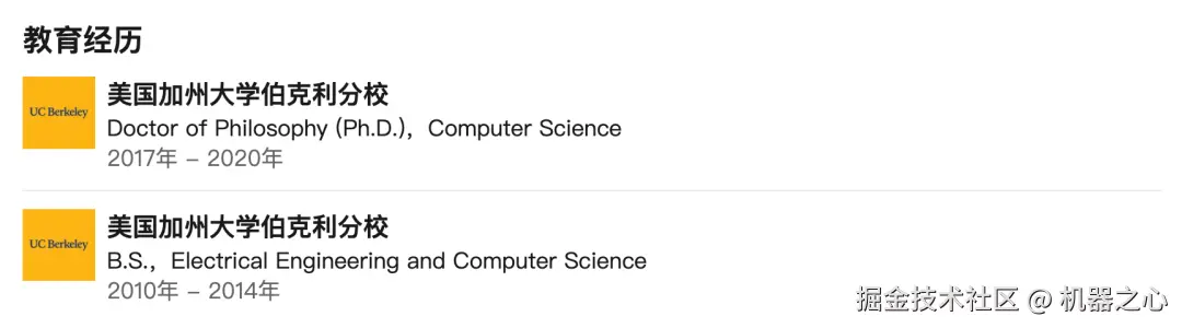 他在加州大学伯克利分校获得了计算机科学博士学位,导师为该校教授、深度强化学习大牛 Pieter Abbeel。之后从事机器人和强化学习研究与工作。在此之前,他还曾在伯克利短暂学习过神经科学,并在加州理工学院学习过物理学。