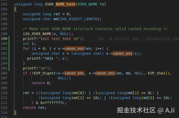 要想使用新方式计算CA的hash,我们需要先获得证书Issuer字段的规范编码内容,我们可以在Openssl的代码中加一点打印,获得输入: