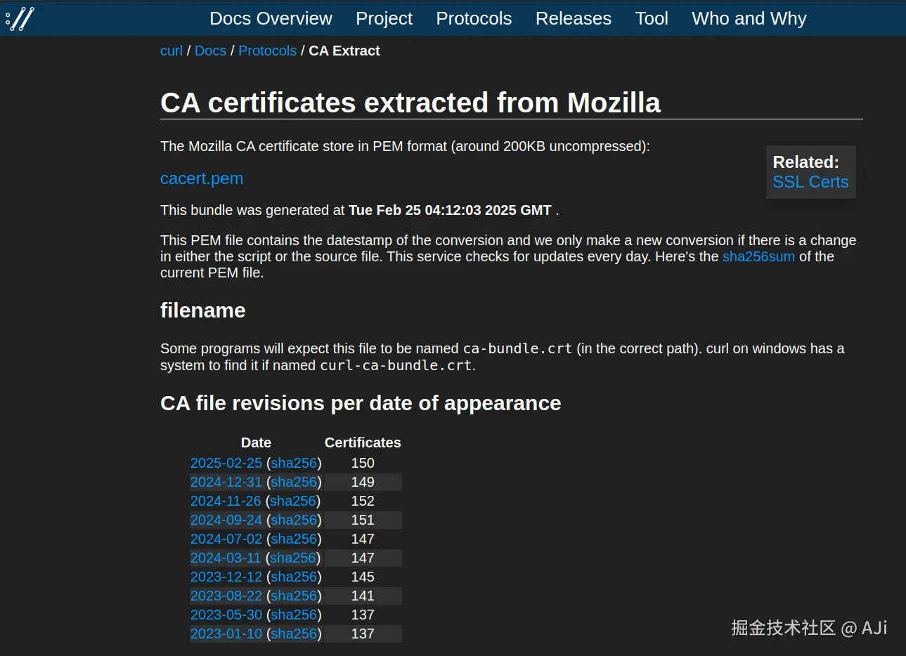 可以在curl的网站CA certificates extracted from Mozilla上下载打包好的CA证书文件(单文件,内含多组CA证书)。在使用Curl时通过CURLOPT_CAINFO传入。