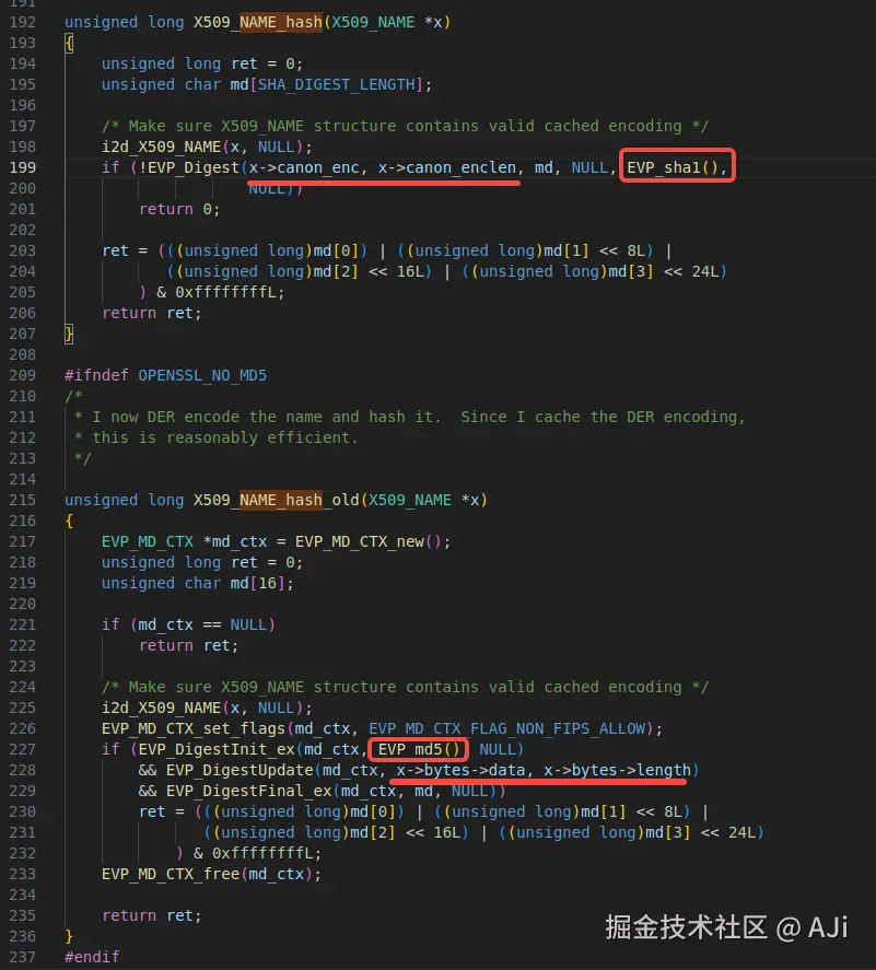 事实上,从代码上看新旧两种方式,不止是Hash算法所用的不一样。 在新版本上,openssl会将证书部分转换成“canonical encoding”(规范编码)的形式,再计算的hash。 以下是新方法X509_NAME_hash()和旧方法X509_NAME_hash_old()的对比,可以看见旧方法中输入是直接使用的x->bytes,而新方法中,输入则是x->canon_enc,并且计算hash的方法也不一样。