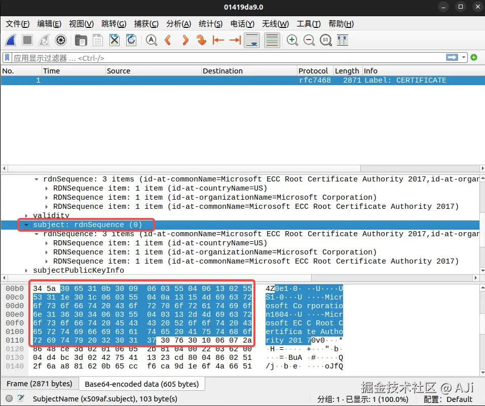 - 将证书文件放入wireshark,可以看到DER格式的证书内容