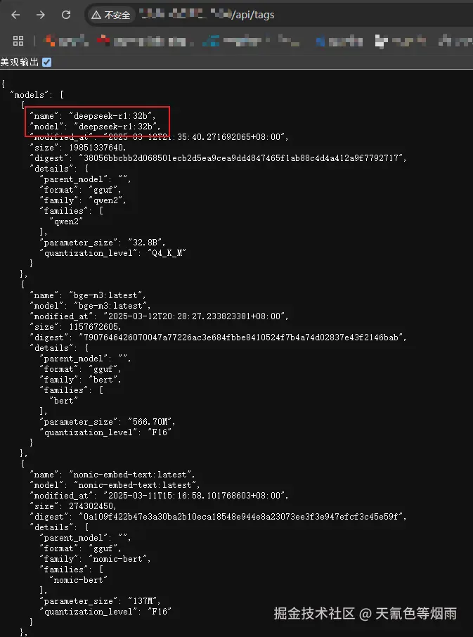 我们随机选择一个服务器,发送一个简单的请求:curl http://<host>:<port>//api/tags,获取 Ollama 已加载的模型: