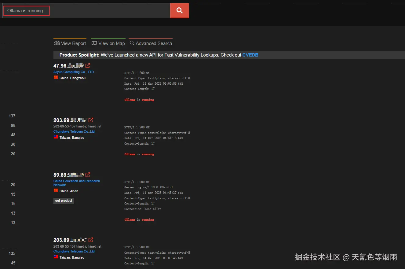 这个说法并不夸张,让我们进入搜索引擎搜索:Ollama is running,大批裸奔的 Ollama 服务暴露在公网上。