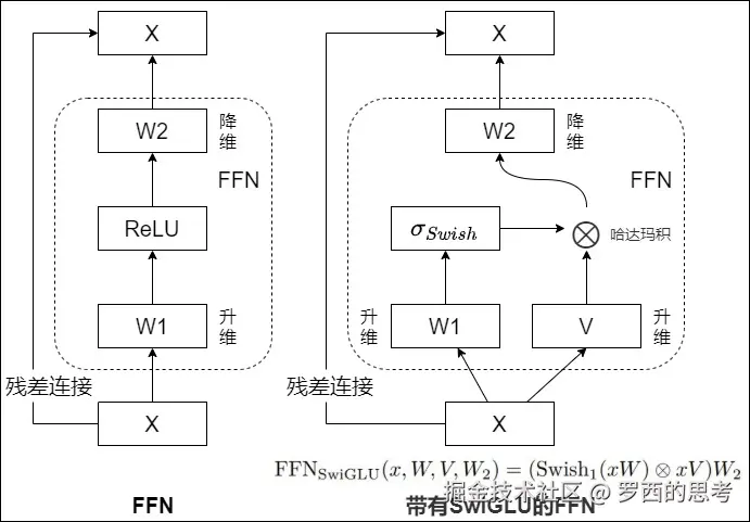 SwiGLU本质上是对Transformer的FFN前馈传播层的第一层全连接和ReLU进行替换。在原生的FFN中采用两层全连接,第一层升维,第二层降维回归到输入维度,两层之间使用ReLE激活函数。SwiGLU也是全连接配合激活函数的形式,不同的是SwiGLU采用两个权重矩阵和输入分别变换,再配合Swish激活函数做哈达马积的操作,因为FFN本身还有第二层全连接,所以带有SwiGLU激活函数的FFN模块一共有三个权重矩阵,其中W1,V为SwiGLU模块的两个权重矩阵,W2为原始FFN的第二层全连接权重矩阵,Swish为激活函数。