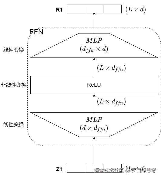 - 第二个线性层。这是第一个线性层的逆操作,将维度降低回原始维度。FFN最终得到的输出矩阵维度与输入X的维度一致。