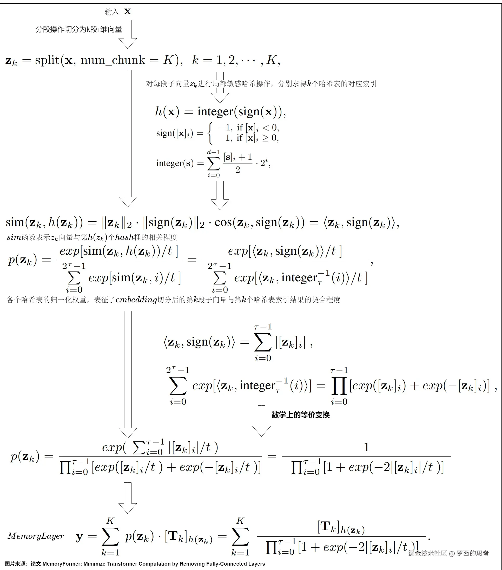 MemoryFormer 的核心在于其 Memory Layer 设计,该层通过内存查找表和局部敏感哈希(LSH)算法取代传统的全连接层。以下是其关键技术细节: