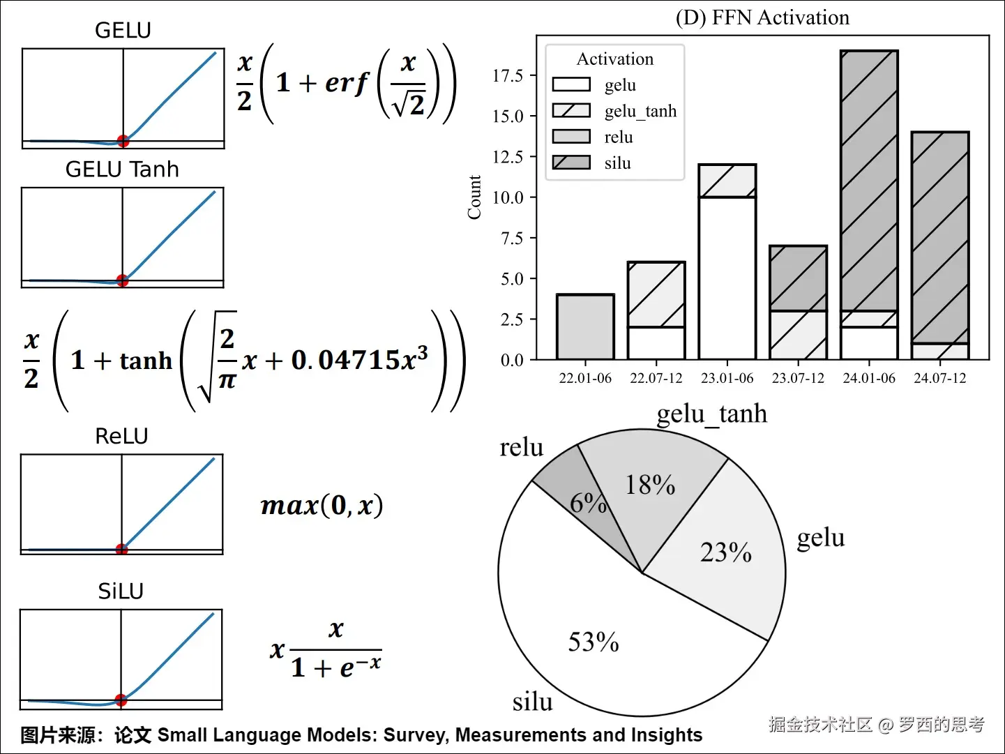 随着时间的推移,这些激活函数的使用发生了变化。在2022年,ReLU成为许多 FFN 的首选激活函数。然而,进入2023年,过渡到使用 GELU 及其变体GELU Tanh。到2024年,SiLU成为激活函数的主要选择。具体如下图所示。