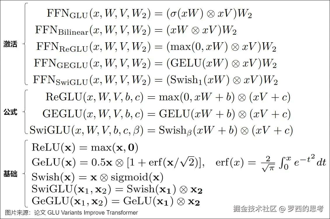这些激活函数在论文“GLU Variants Improve Transformer”中有具体论述,该论文提出使用GLU的变种(将GLU中原始的Sigmoid激活函数替换为其他的激活函数)来改进Transformer的FFN层,并列举了替换为ReLU,GELU和SwiGLU的三种变体。命名上将激活函数的缩写加在GLU前面作为前缀。论文用这种GLU变体替换FFN中的第一层全连接和激活函数,并且去除了GLU中偏置项bias。具体公式如下。
