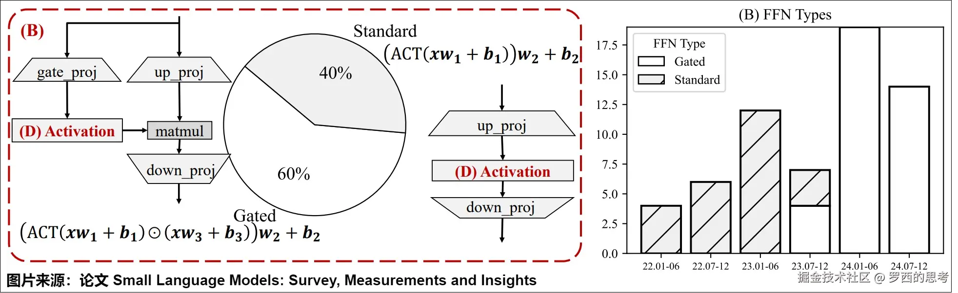 随着时间的推移,人们对这些前馈神经网络类型的偏好也发生了变化。上图的右侧显示了2022年至2024年SLM使用的前馈网络类型的趋势,标准的 FFN 正在逐步被门限 FFN 所取代。本篇我们主要介绍标准FFN,就是Transformer论文的实现。