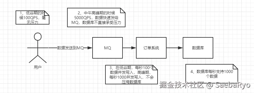 消息被MQ保存起来了,然后系统就可以按照自己的消费能力来消费,比如每秒1000个数据,这样慢慢写入数据库,这样就不会卡死数据库了。