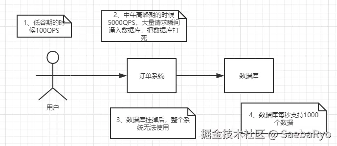 如订单系统,在下单的时候就会往数据库写数据。但是数据库只能支撑每秒1000左右的并发写入,并发量再高就容易宕机。低峰期的时候并发也就100多个,但是在高峰期时候,并发量会突然激增到5000以上,这个时候数据库肯定卡死了。