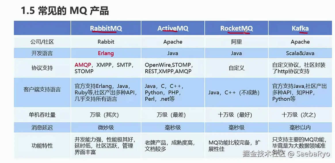 - RabbitMQ:基于AMQP协议,erlang语言开发,稳定性好