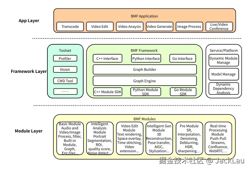 简单介绍BMF项目的组成,官方分为了三个层级 应用层、框架层、模块层。这并非意味模块层是最底层,而是因为模块是应用业务逻辑的核心,其底层实现其实还是框架层的module sdk。