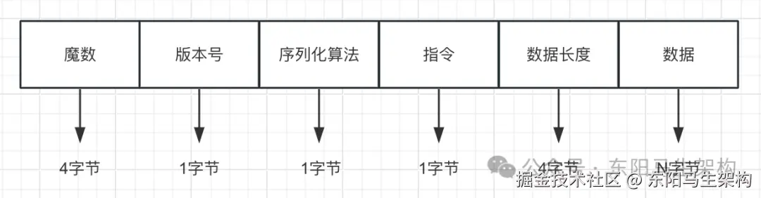 注意:设计协议时通常会在数据包的开头加上一个魔数,以便可以尽早屏蔽非本协议的客户端。通常会在第一个Handler对每个客户端发过来的数据包做一次快速判断,看是否满足自定义协议。比如可以继承LengthFieldBasedDecoder的decode()方法,然后在decode()之前判断前4字节是否等于定义的魔数。