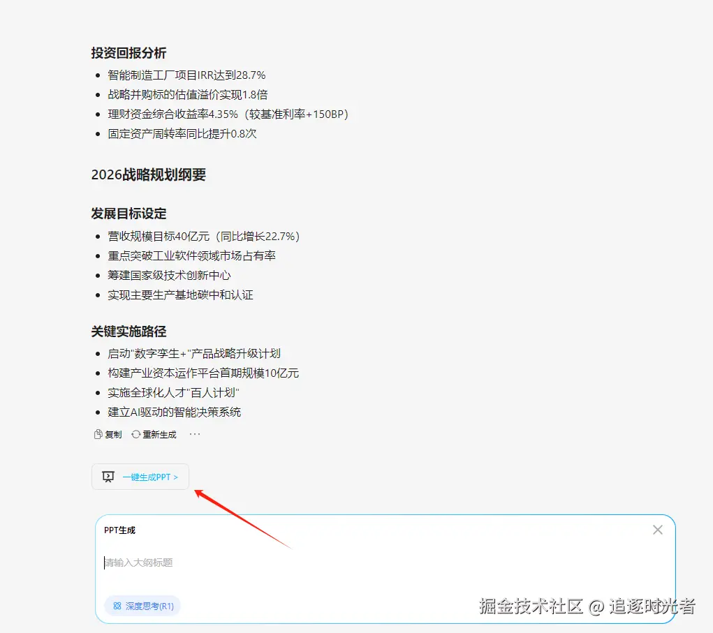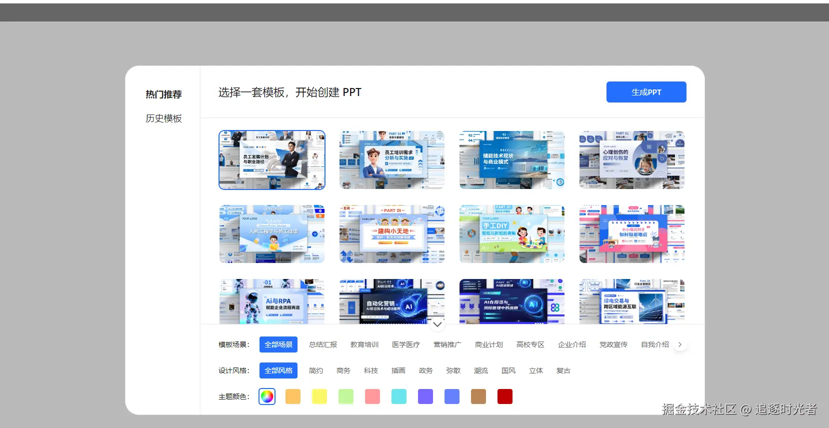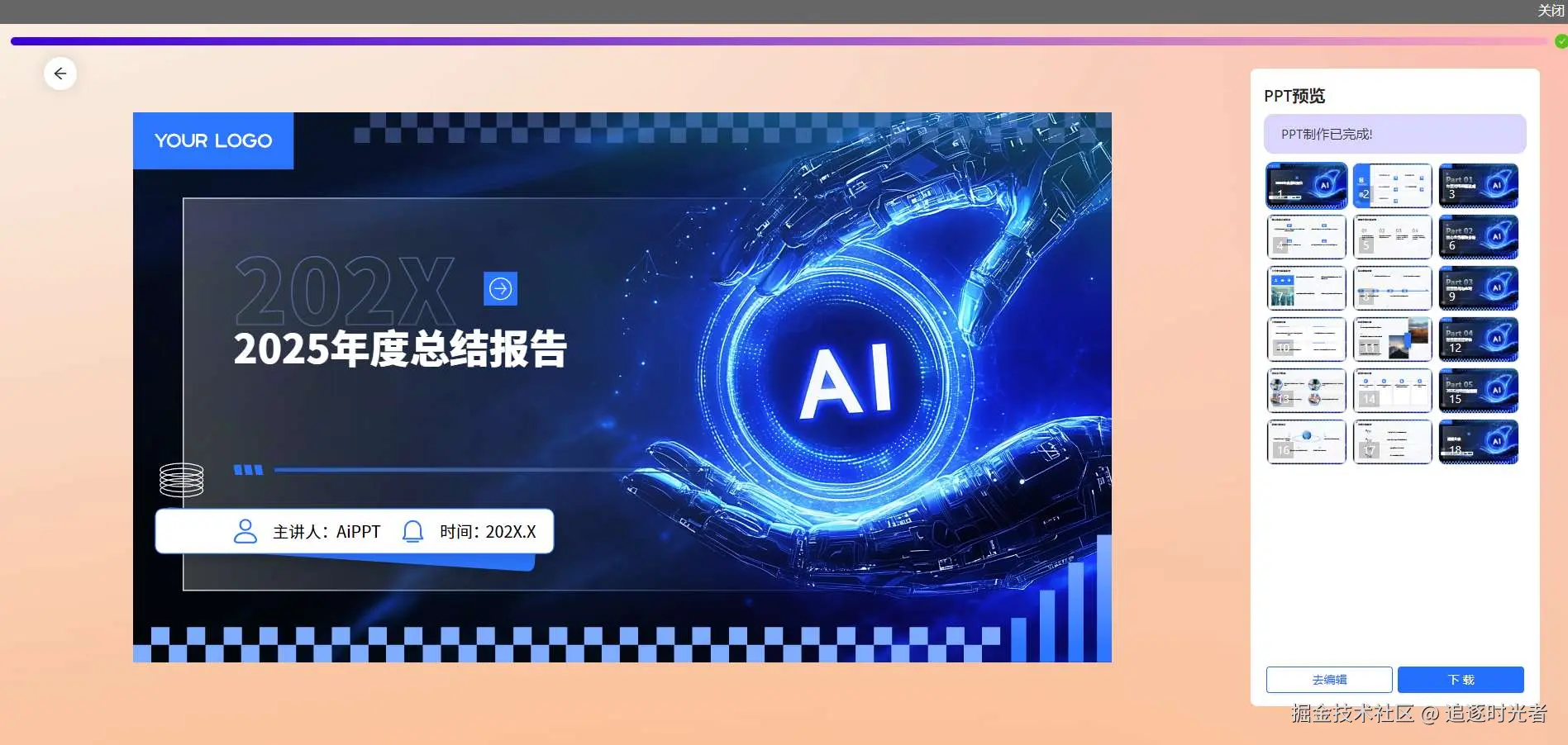 - 智能PPT生成:用户只需输入主题或要求即可一键生成包含文本、布局和设计的完整PPT,支持多格式导出。