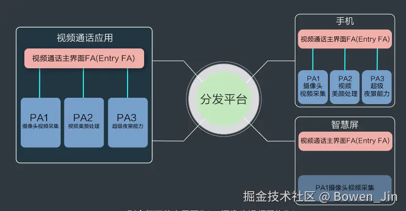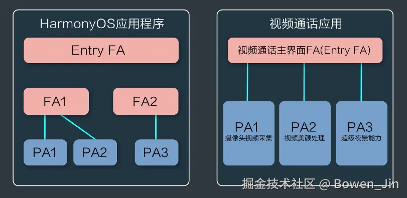 有一个作为视频通话的主界面FA,和若干个PA组成。