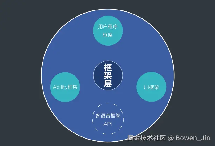 App与系统交互的桥梁, 为App开发提供JavaScript、C、C++和ArkTS等多语言的开发框架, 以及UI框架,Ability框架等开放API