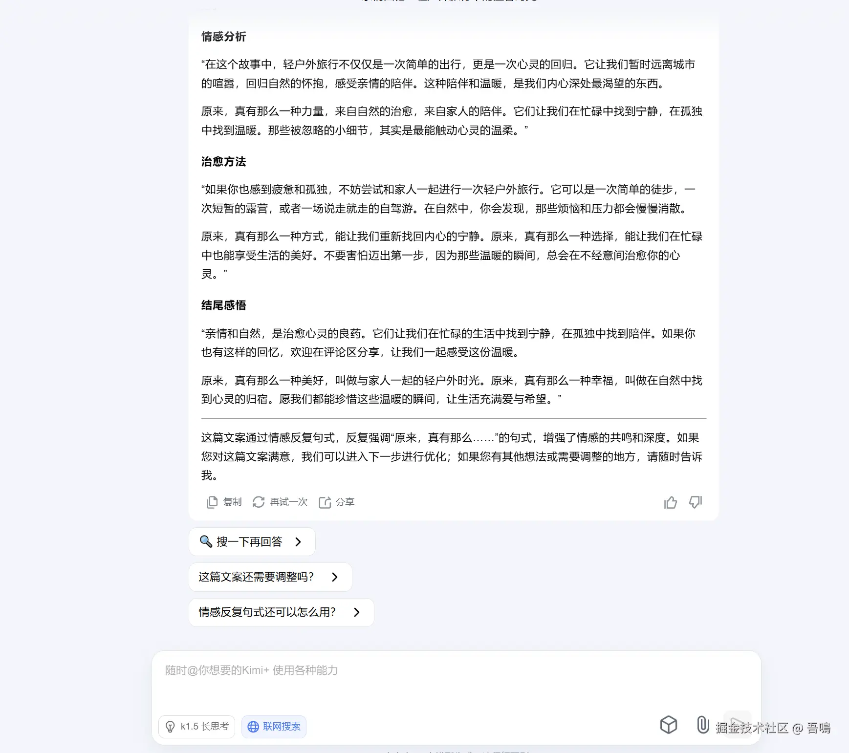 通用大模型要想很好的运用好它,还是得要靠提示词,所以今天如果想要让Kimi、豆包(GPT、文心一言等同样适用)能写出暖心治愈的情感文案,提示词非常的重要。今天吾鳴要分享的也是提示词,不过这个提示词非常的长,可以和Kimi进行多轮对话,并且Kimi会询问你的目标受众,创作素材来源,写作风格等。提示词很长,我放在了文末。下面的演示,我选择使用Kimi进行演示。