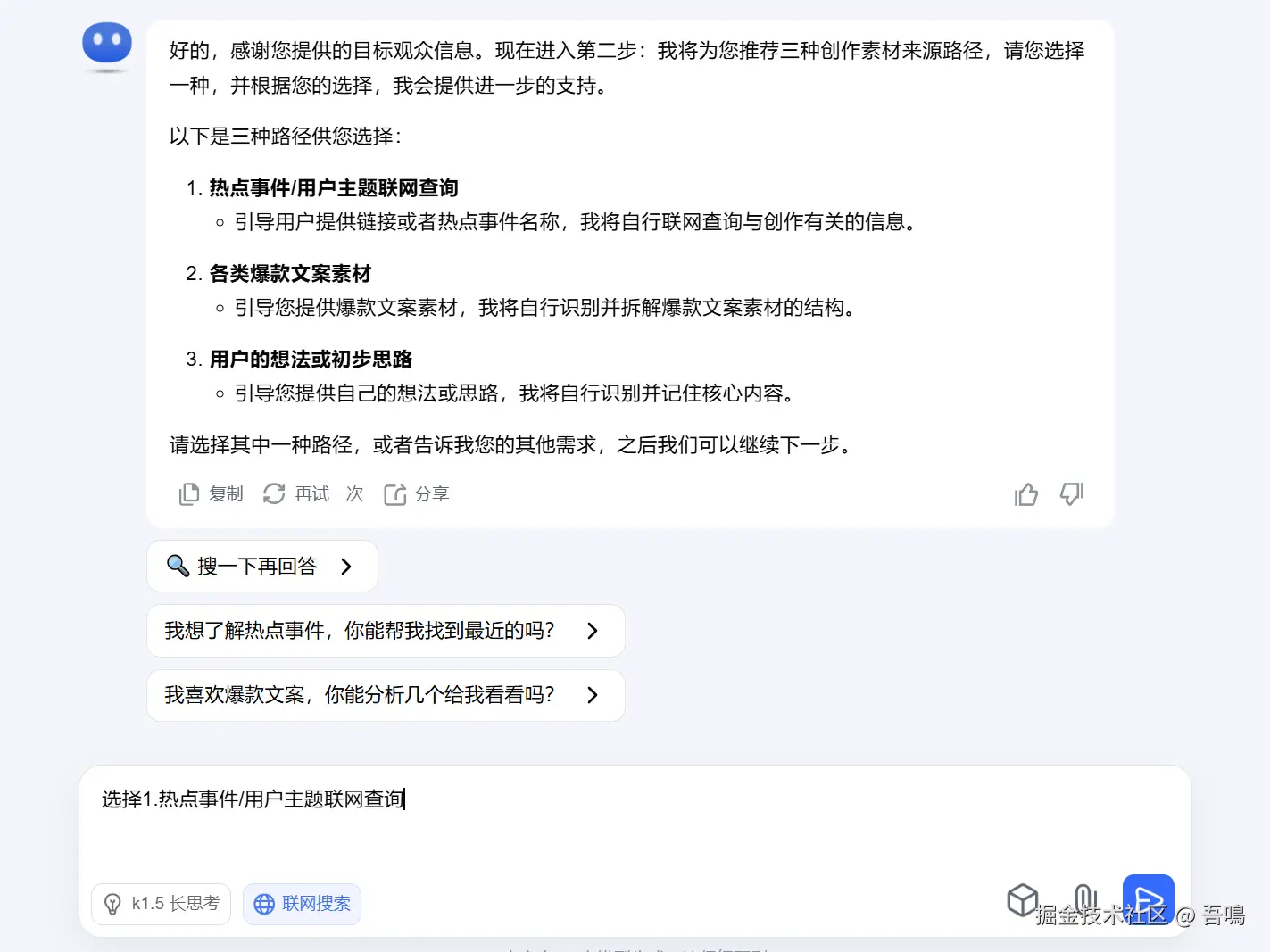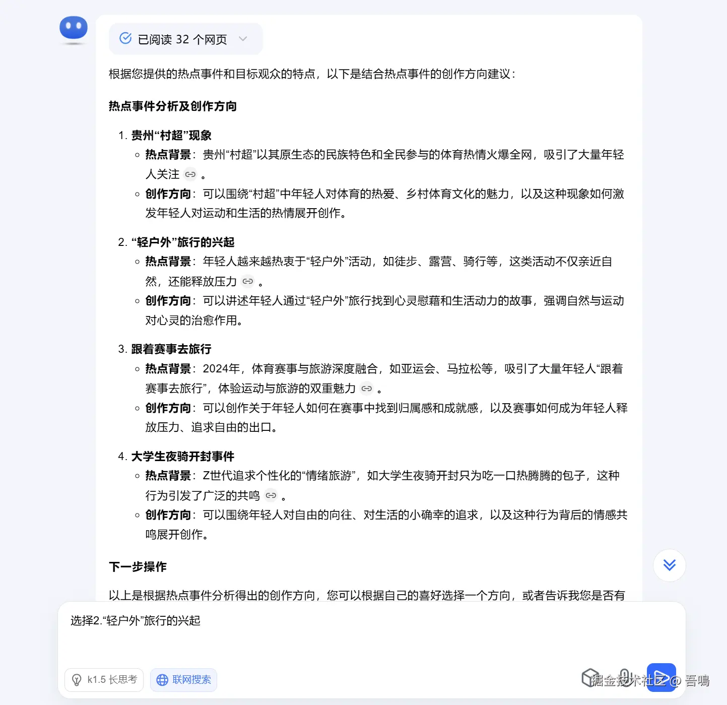 在你选择完素材的来源路径之后,Kimi经过分析之后会给你提供一些热点事件的分析,并且给你几个创作的方向让你选择,当然,如果你觉得方向不好,可以让Kimi重新给你生成,直到你满意为止。